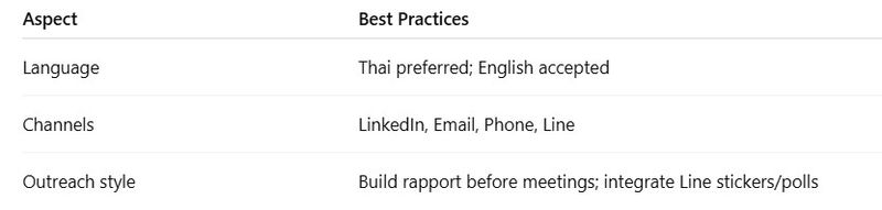 Bangkok-specific SDR strategies focus on trust-building. Thai language preferred, English accepted. Multi-channel outreach includes LinkedIn, email, phone, and Line. Relationship-building with Line features improves meeting acceptance.