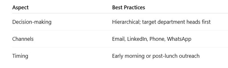 This table outlines Manila-specific SDR practices. Prioritize key decision-makers; use multi-channel outreach combining LinkedIn, email, phone, and WhatsApp. Timing aligns with local working hours, maximizing response.