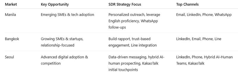 This table summarizes key opportunities, SDR strategy priorities, and top-performing communication channels in Manila, Bangkok, and Seoul. Manila focuses on English-friendly outreach and WhatsApp follow-ups; Bangkok prioritizes relationship-building via Line; Seoul leverages hybrid AI-human SDR teams and concise, data-driven messaging.