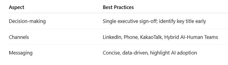 Seoul-specific SDR practices emphasize speed, precision, and digital sophistication. Identify key decision-makers early. Multi-channel engagement with LinkedIn, phone, KakaoTalk, and hybrid AI-human SDR teams maximizes outreach efficiency. Concise, data-driven messaging resonates in this mobile-first market.