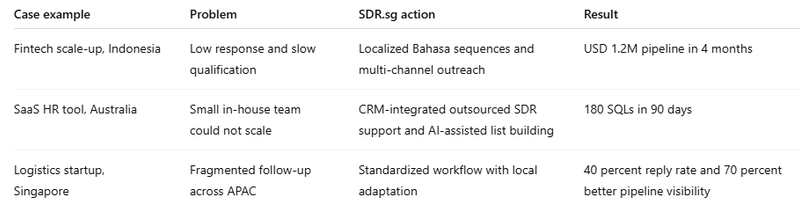 The same SDR.sg benchmark article includes examples such as a fintech scale-up in Indonesia generating USD 1.2 million in pipeline in four months, a SaaS HR tool in Australia producing 180 SQLs in 90 days, and a logistics startup in Singapore improving pipeline visibility by 70 percent.