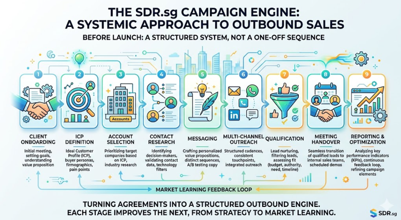 This infographic shows how SDR.sg turns a signed client agreement into a structured outbound engine. Each stage improves the next one, from strategy to market learning.