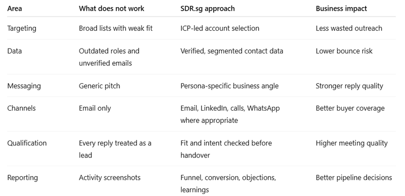 This table shows why outsourced SDR work is not just activity. The biggest improvement usually comes from sharper targeting, cleaner data, stronger qualification, and tighter feedback loops.