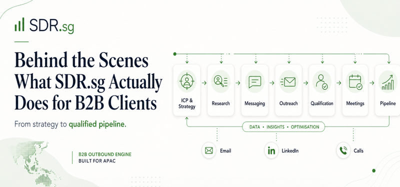 Behind the scenes, SDR.sg helps B2B clients turn outbound from random activity into a structured pipeline engine. Through outsourced SDR services APAC, we identify the right accounts, reach the right decision makers, qualify real interest, and book meetings that sales teams can actually progress.