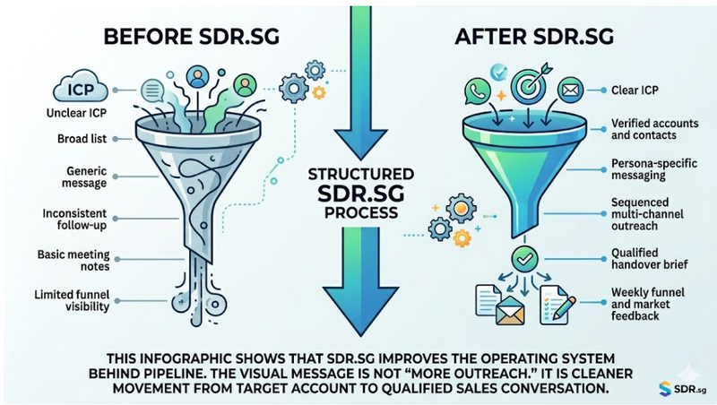 This infographic should show that SDR.sg improves the operating system behind pipeline. The visual message is not “more outreach.” It is cleaner movement from target account to qualified sales conversation.