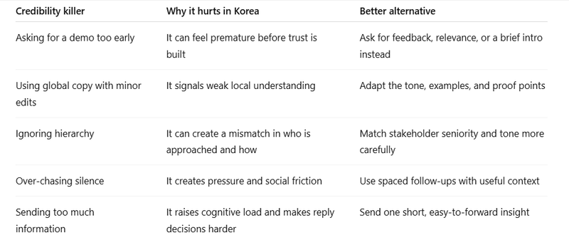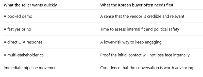 This is also where segmentation matters. A chaebol-style enterprise environment may require more internal comfort, stakeholder mapping, and proof before a meeting gets traction, while a smaller Korean company may move faster once relevance is clear. The principle is the same in both cases: reduce risk first, then ask for progression.