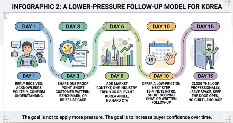 In Korea, your follow-up should not sound like a chase. It should sound like a responsible continuation of a relevant conversation. That means fewer nudges for the sake of nudging, and more follow-ups that actually help the buyer think.