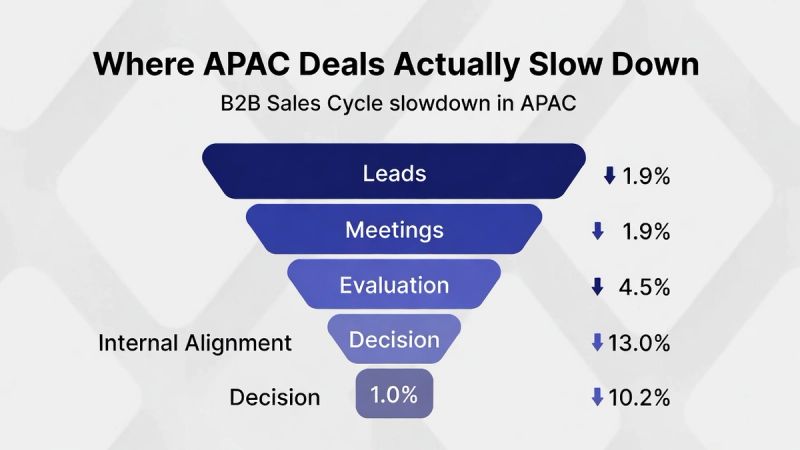 Data from the 6sense Buyer Experience Report shows the average B2B sales cycle now exceeds 10–11 months globally, with APAC often longer due to consensus-based decision-making.