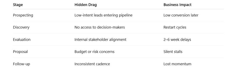 Invisible drags are delays that don’t appear as clear “lost reasons” in CRM but slow pipeline velocity and overall deal progression.