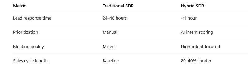 AI identifies high-intent accounts and optimal timing, while human SDRs manage conversations and qualification. This hybrid model improves deal progression and accelerates revenue.