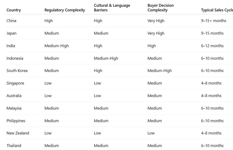 This table illustrates the relative complexity of APAC markets for SDR outreach, factoring in regulation, culture/language barriers, and decision-making structure. It highlights why certain markets (China, Japan) require more sophisticated multi-stakeholder and localized strategies, while others (Singapore, Australia, New Zealand) allow faster entry and simpler outreach.