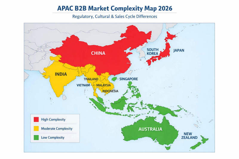 Color-coded APAC map showing regulatory, cultural, and decision-making complexity by market: red = high complexity (China/Japan), yellow = medium (India/SEA), green = low (SG/AU/NZ).
