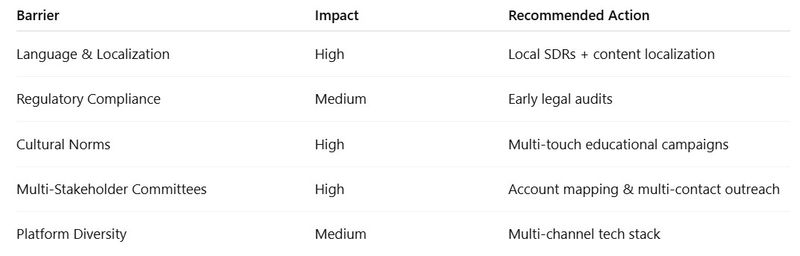 Before entering APAC, SDR teams must anticipate key barriers that can slow pipeline progress. This table summarizes common obstacles and recommended strategies.