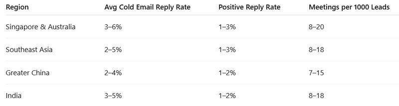 This table provides practical benchmarks for APAC outbound campaigns. “Avg Cold Email Reply Rate” reflects typical performance, while “Positive Reply Rate” shows the subset of replies that indicate genuine interest. Meetings per 1000 leads demonstrate achievable pipeline outcomes when hybrid AI + human SDR workflows are applied.