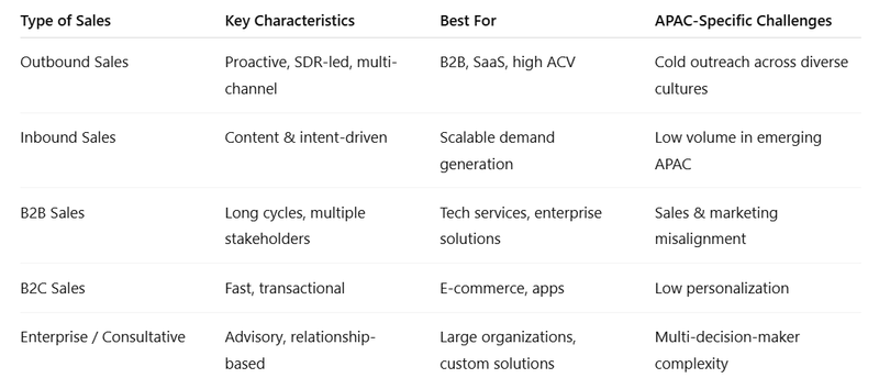 Mastering the five types of sales, with a strong emphasis on outbound, equips sales leaders to navigate APAC complexities. Addressing challenges like cold outreach, personalization, and automation ensures predictable, scalable growth.