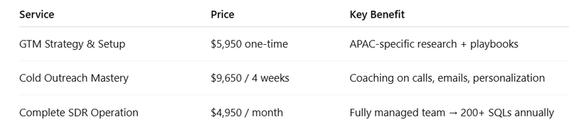 At SDR.sg, we focus on launching effective outbound channels, generating qualified leads, and building top-of-funnel revenue streams. Our unique value proposition lies in engineering APAC expansion with over 200 successful go-to-market plays, delivering 95%+ verified contact accuracy, and achieving 30%+ conversion rates through tailored messaging that respects cultural nuances. Weโve helped more than 150 clients, including SaaS, fintech, and AI companies like Rappier, Ernst & Young, Dexecure, Refinitiv, and Aut0m8r, overcome challenges like revenue stagnation, slow deal cycles, and inconsistent lead quality.
