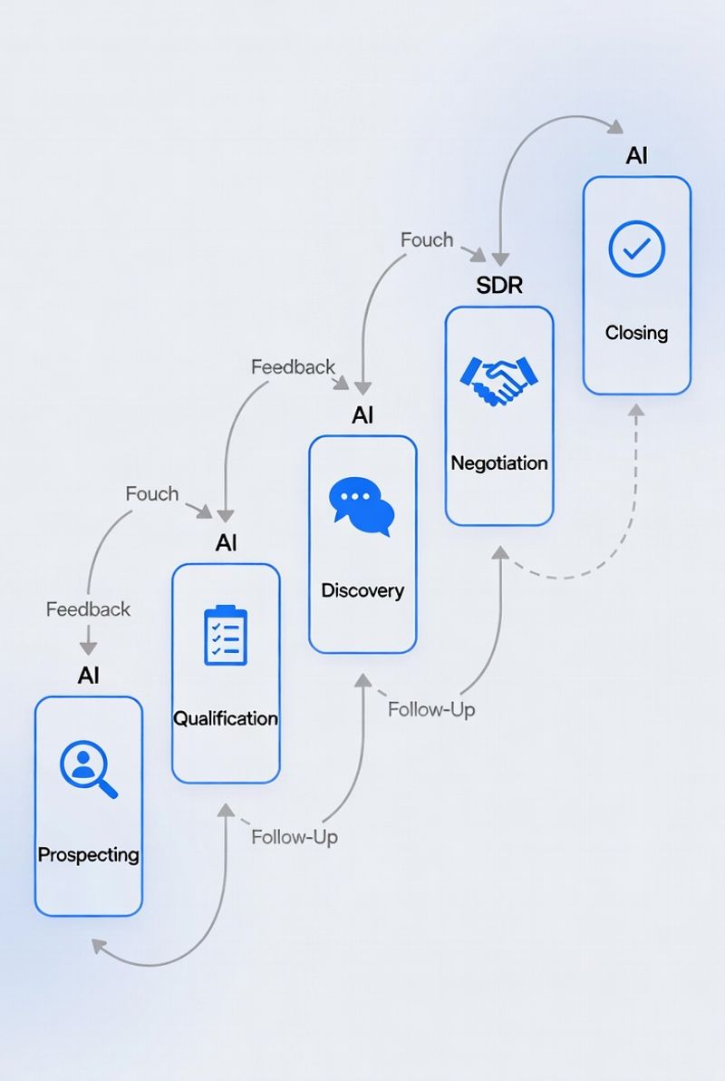 This diagram shows a 5-stage B2B sales pipeline with AI and human SDR roles. Arrows indicate feedback loops and follow-ups, helping APAC B2B teams see how leads move efficiently through Prospecting, Qualification, Discovery, Negotiation, and Closing.