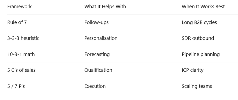 This table summarizes key sales principles and frameworks that help B2B teams in APAC maintain discipline. Each principle is contextualized, explaining when and how to use it, making the content rich for Google and valuable for readers.