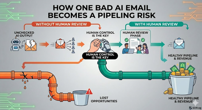 A useful way to understand SDR.sg’s approach is to compare what happens when AI output is sent too quickly versus when it goes through human review.