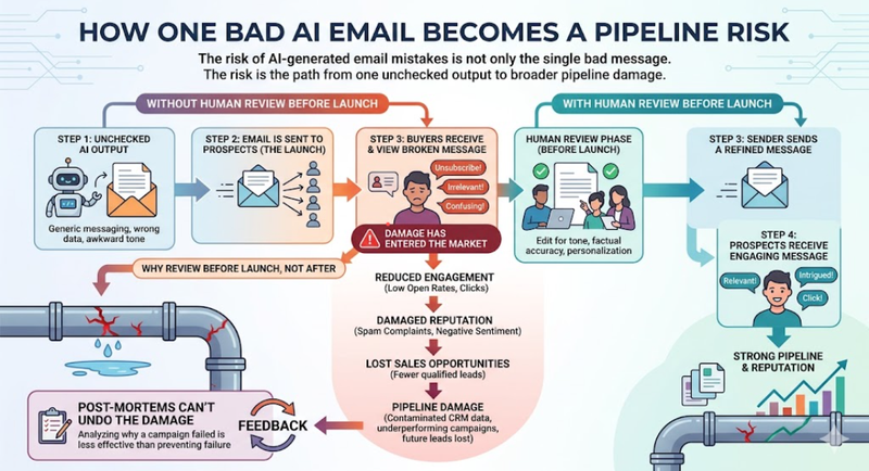 The risk of AI-generated email mistakes is not only the single bad message. The risk is the path from one unchecked output to broader pipeline damage.