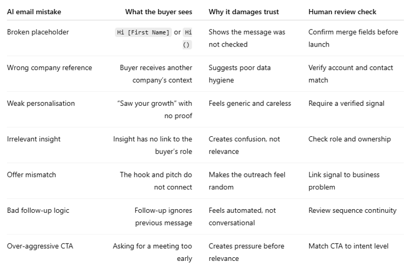 The most common mistakes include broken placeholders, wrong company references, weak personalisation, irrelevant insights, wrong persona messaging and follow-ups that ignore previous context.