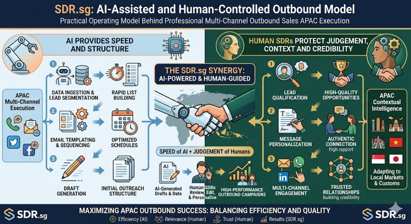 AI improves speed and structure. Human SDRs protect judgement, context and credibility. This is the practical operating model behind professional multi-channel outbound sales APAC execution.