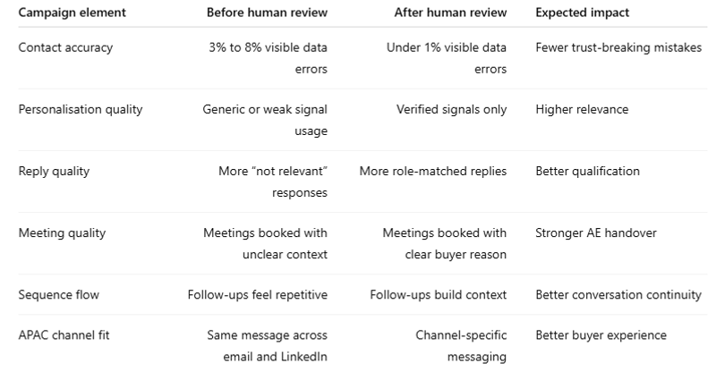 These are practical quality-control benchmarks for an AI-assisted outbound workflow. The exact numbers vary by industry and campaign, but the direction is consistent: human review reduces visible errors and improves commercial relevance before outreach reaches buyers.
