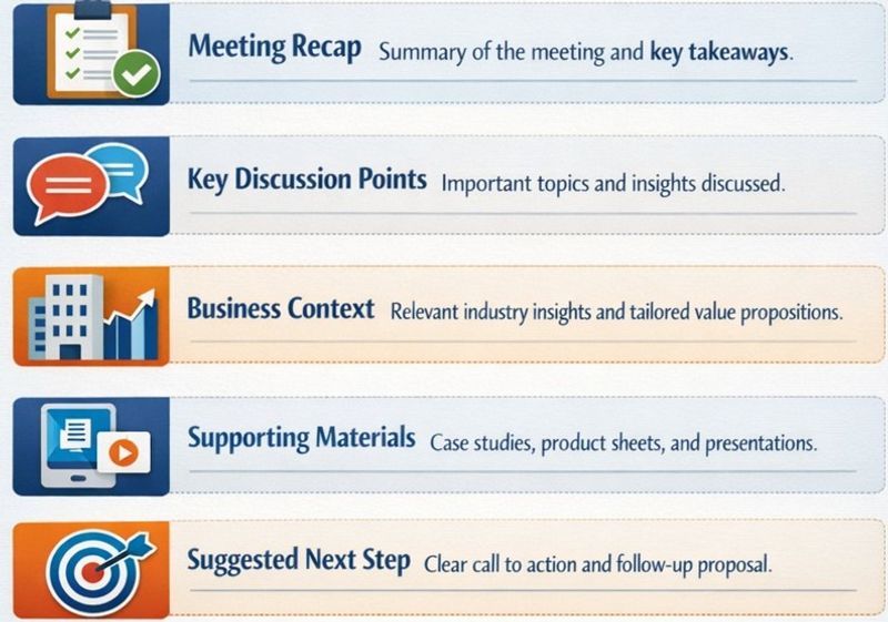 “As discussed, here’s a summary of key points + attachment comparing your current workflow and how our tool can reduce manual tasks by ~30% (based on similar Japanese clients). Please share with relevant colleagues.”