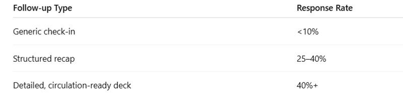- Introduced structured follow-ups and decks for circulation