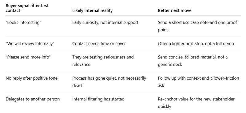 That has a very practical implication for outbound. A positive reply may signal openness, not commitment. It may also mean “not yet,” “I need to check internally,” or “I do not want to reject this directly.”