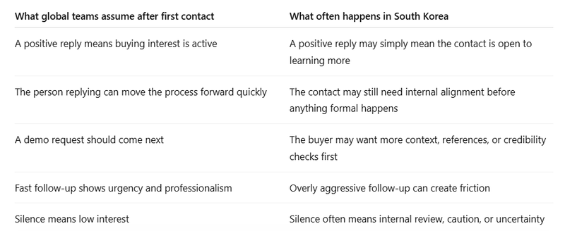 This is where local nuance matters. One useful concept here is nunchi, the idea of reading the room and sensing what is not being said directly. You do not need to build a whole sales playbook around that word, but you do need to understand the behavior behind it. If you only read the literal text of a reply, you can easily misread the actual buying signal. That is especially true in a market where indirect communication and group harmony matter more than blunt clarity ( Business Guides South Korea ).